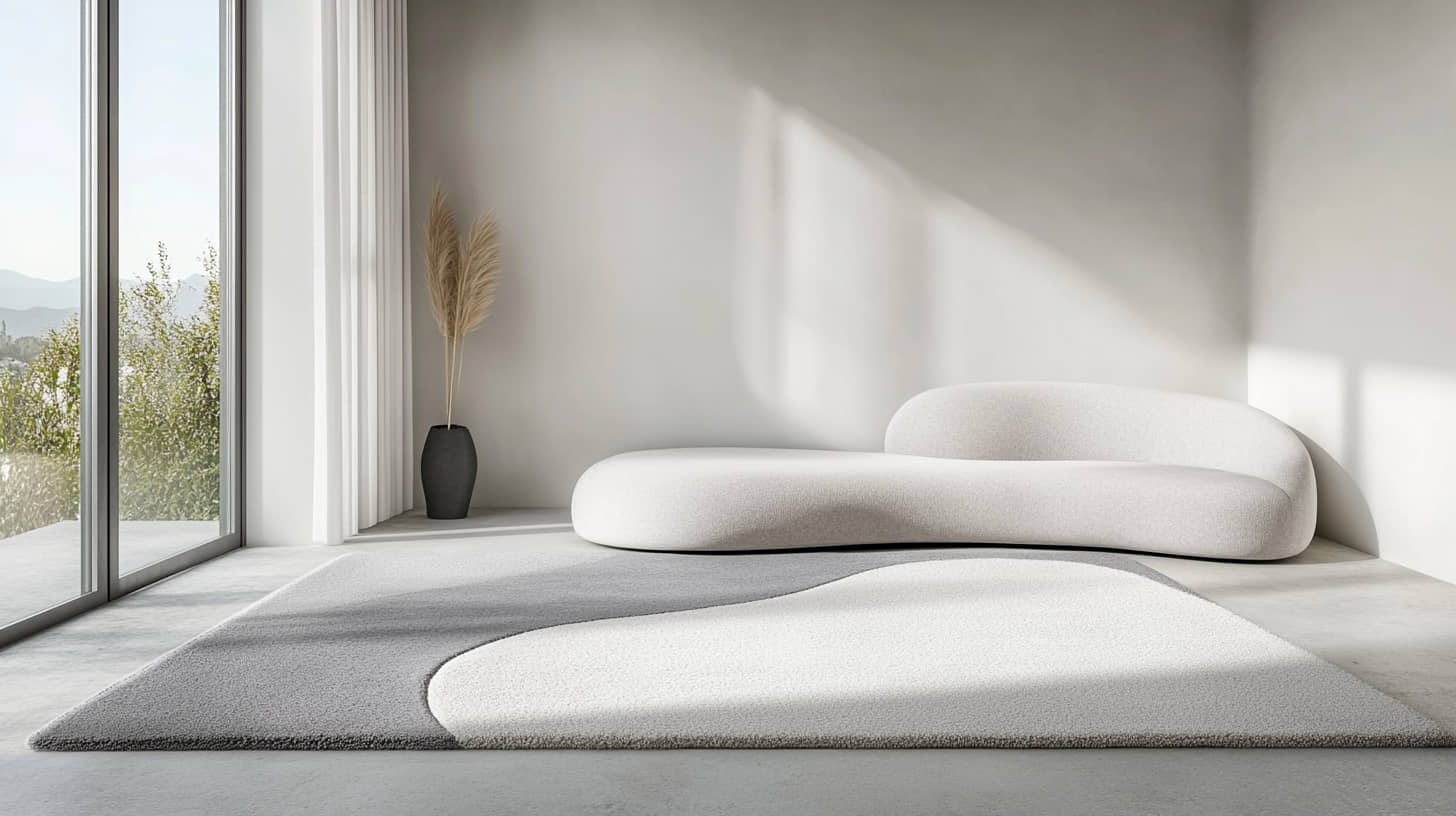$228 – $900Price range: $228 through $9000 out of 5Select options This product has multiple variants. The options may be chosen on the product pageMinimalist Crescent Abstract Rug – Monochrome Elegance in Black and Ivory Tones