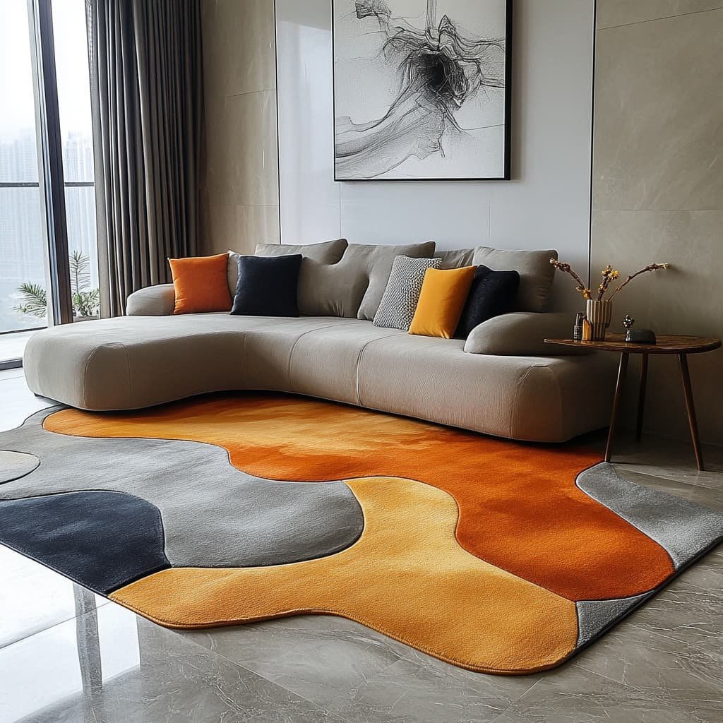 Handcrafted Modern Wool Rug with Bold Orange, Grey, and Black Design – Luxury Rug for Contemporary Living Rooms and Bedrooms