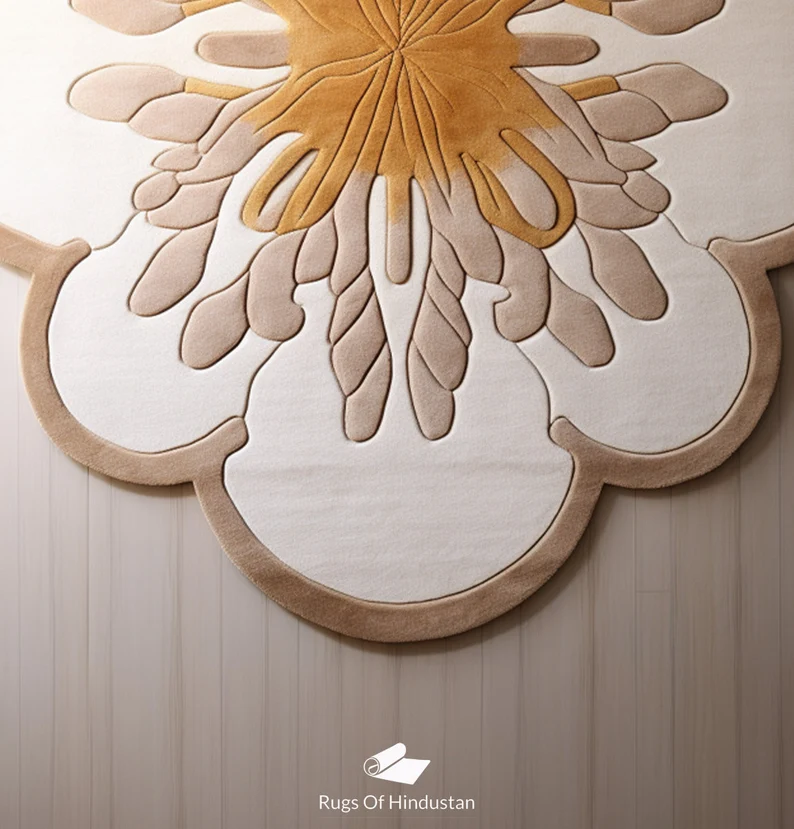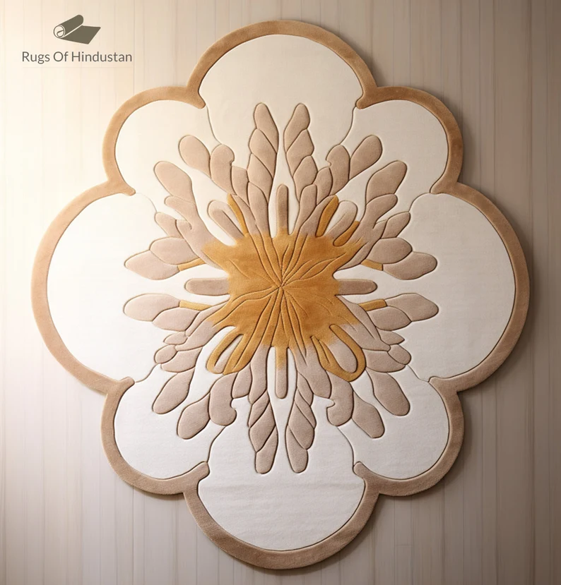 Unique Design: Floral-shaped rug with beige and gold hues for a luxurious aesthetic.