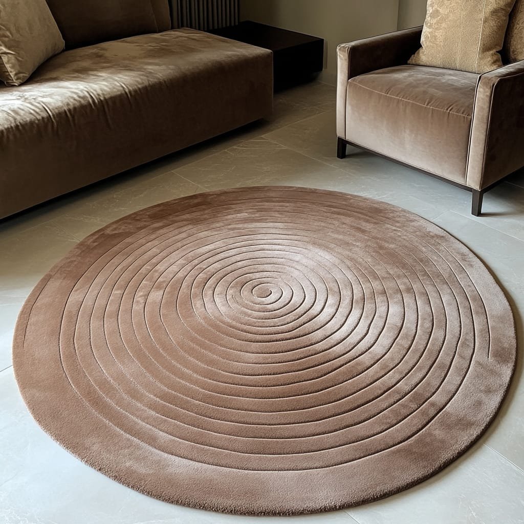 Bring modern elegance to your interiors with this luxurious round beige rug, designed to complement any minimalist or contemporary decor style. Its concentric circle pattern creates a subtle yet striking visual appeal, making it a perfect centerpiece for living rooms, bedrooms, or lounges.